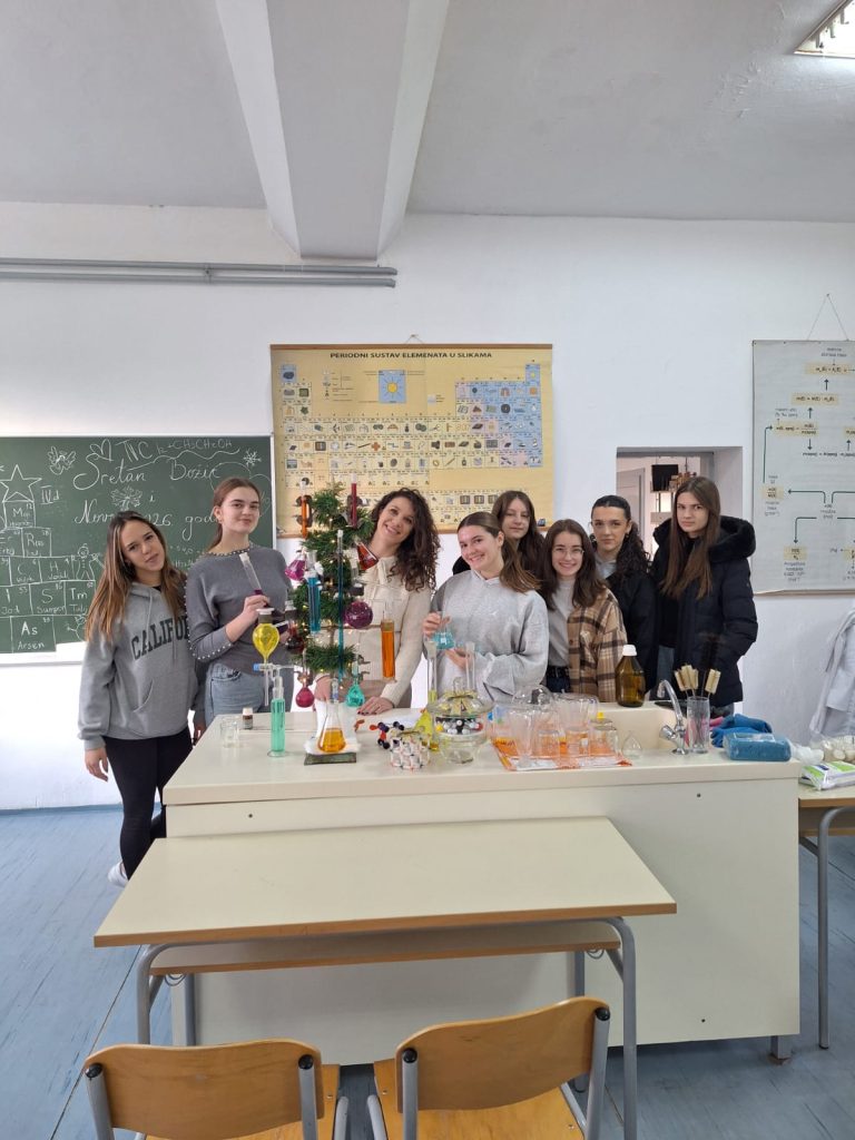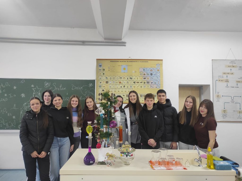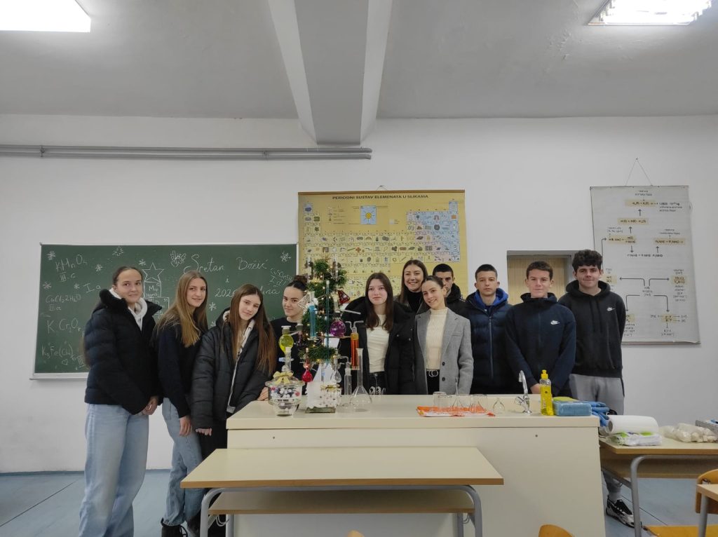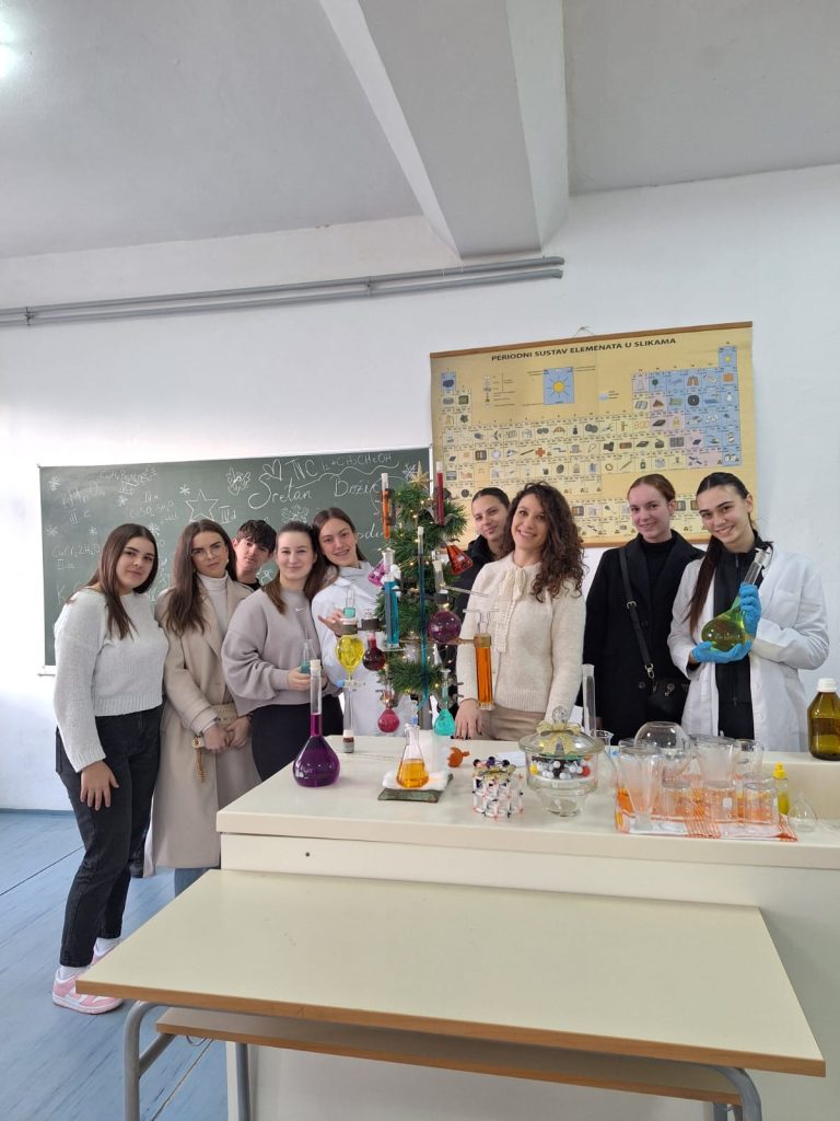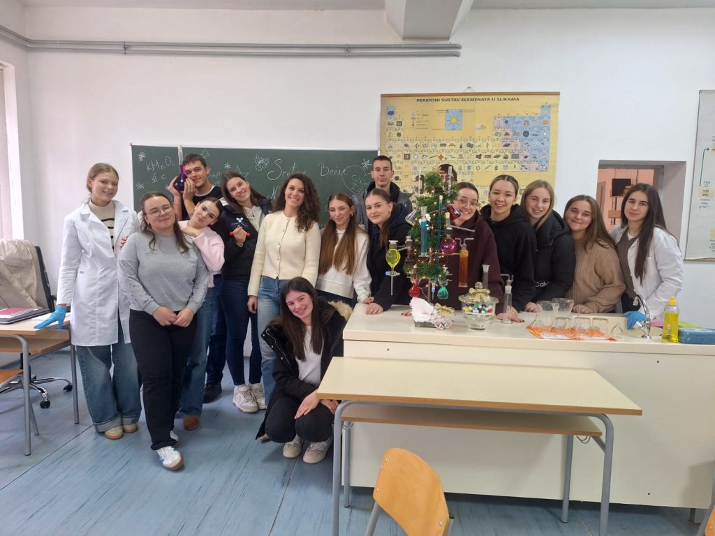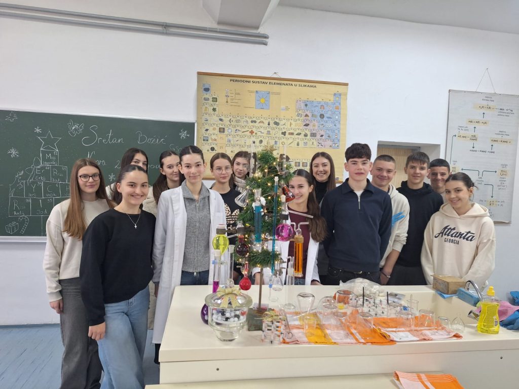 Veselo je ovih dana bilo u kemijskom kabinetu Gimnazije Marka Marulića. Učenici svih razreda imali su zadatak ukrasiti božićnu jelku uz pomoć profesorica Ivone Krišto i Ivane Andrić. No, ukrasi nisu bili uobičajeni. Pripremale su se otopine različitih boja i koncentracija na oduševljenje učenika. Ispod jelke nalazili su se prigodni kemijski pokloni- “slatkiši” napravljeni od modela atoma i molekula.