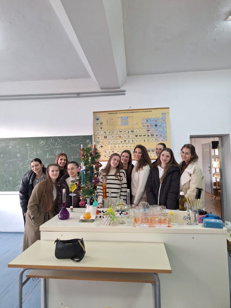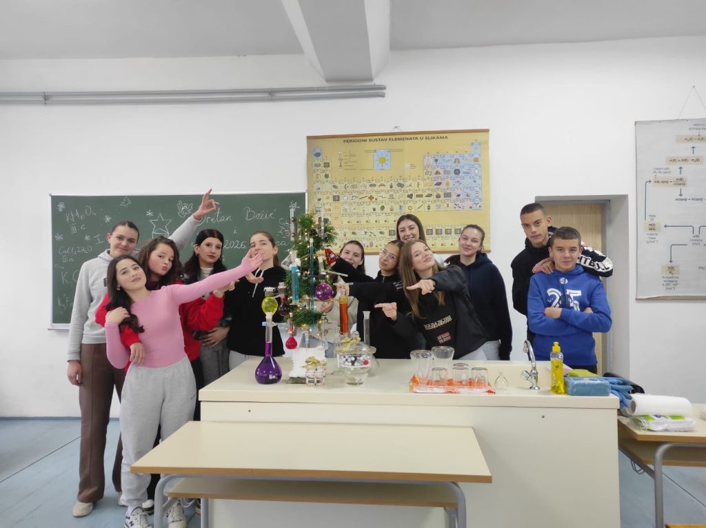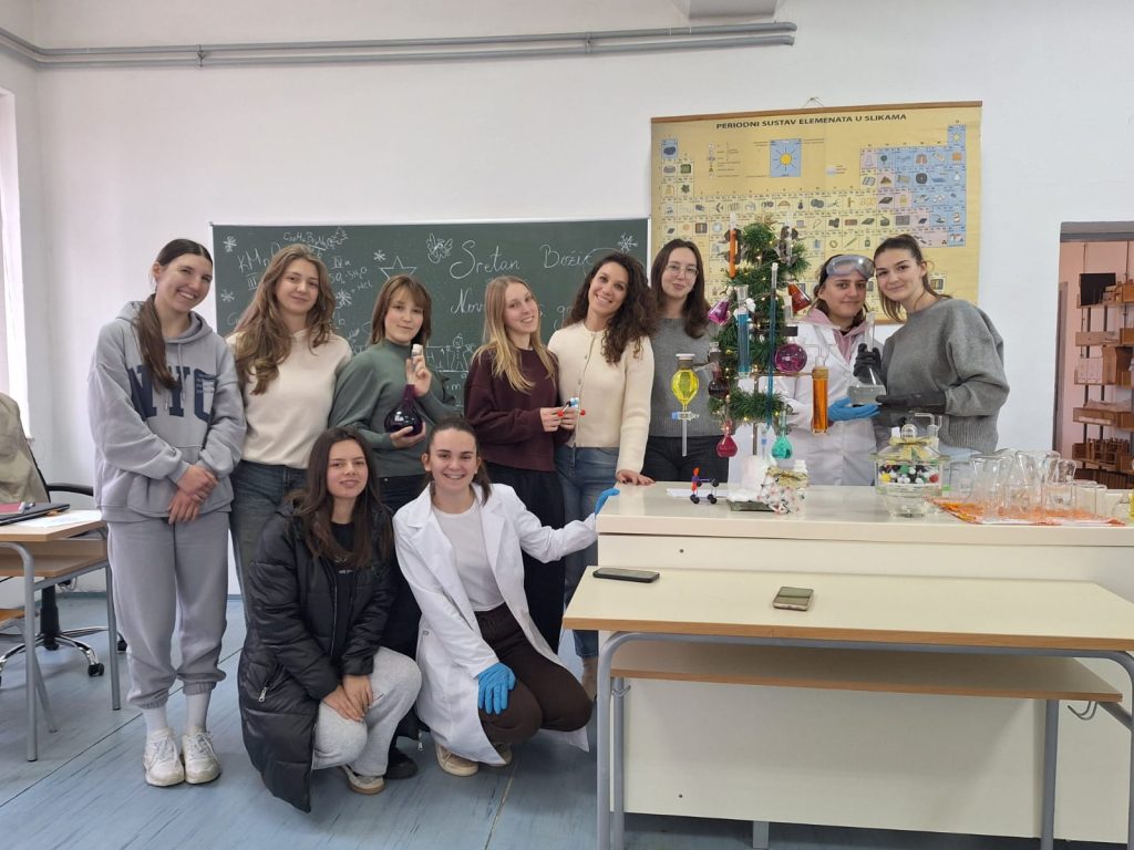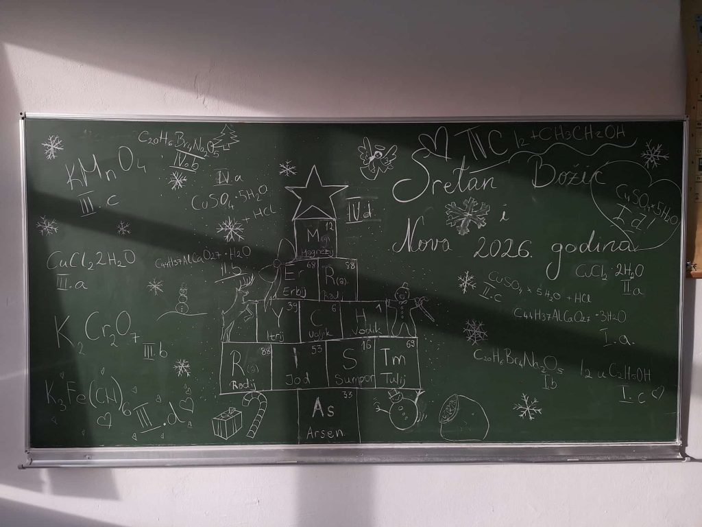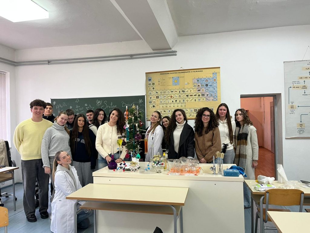 Veselo je ovih dana bilo u kemijskom kabinetu Gimnazije Marka Marulića. Učenici svih razreda imali su zadatak ukrasiti božićnu jelku uz pomoć profesorica Ivone Krišto i Ivane Andrić. No, ukrasi nisu bili uobičajeni. Pripremale su se otopine različitih boja i koncentracija na oduševljenje učenika. Ispod jelke nalazili su se prigodni kemijski pokloni- “slatkiši” napravljeni od modela atoma i molekula.