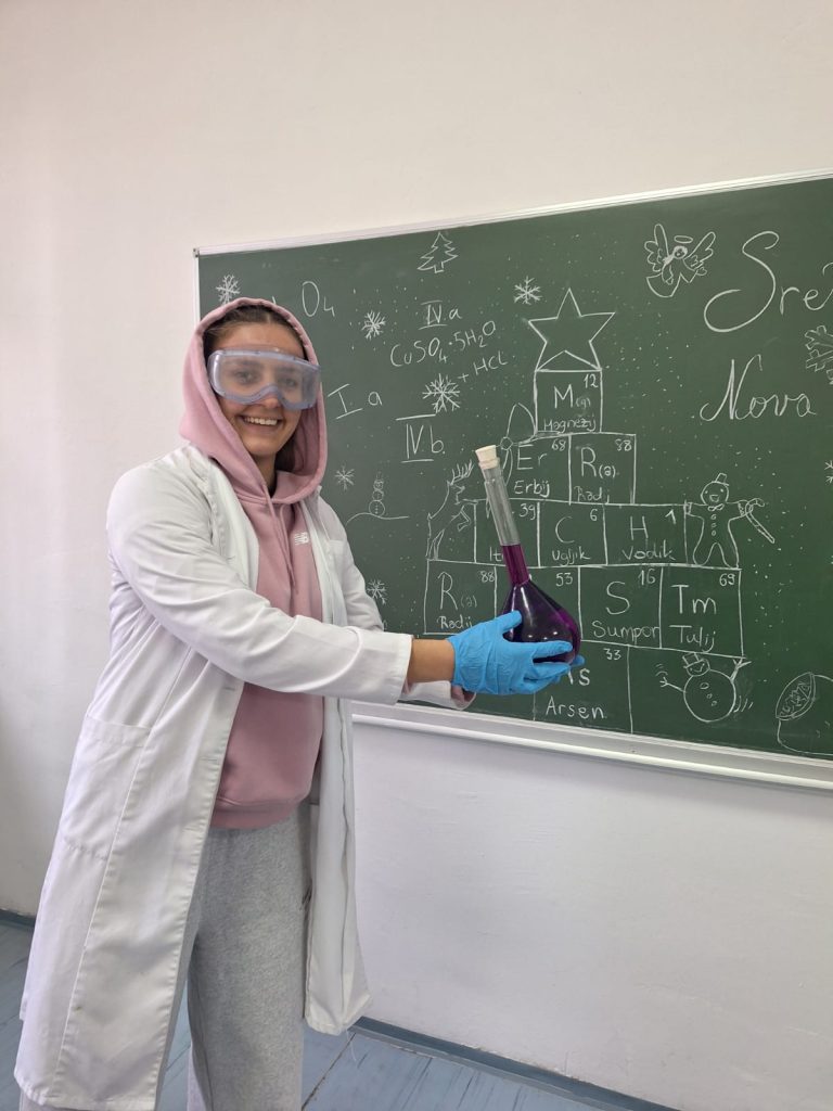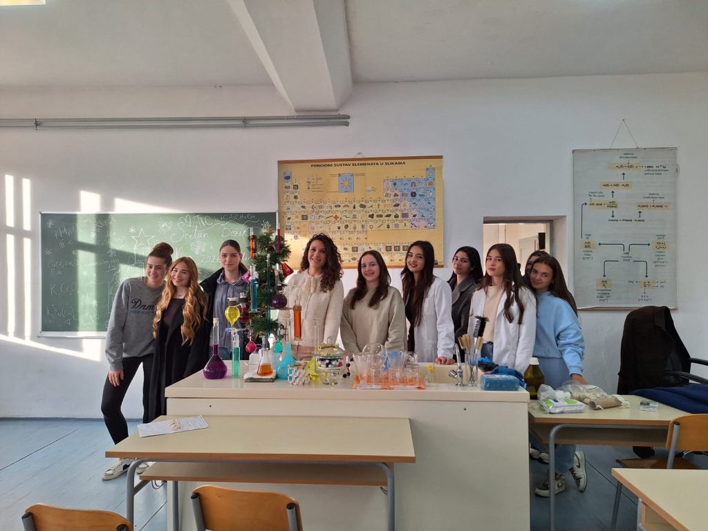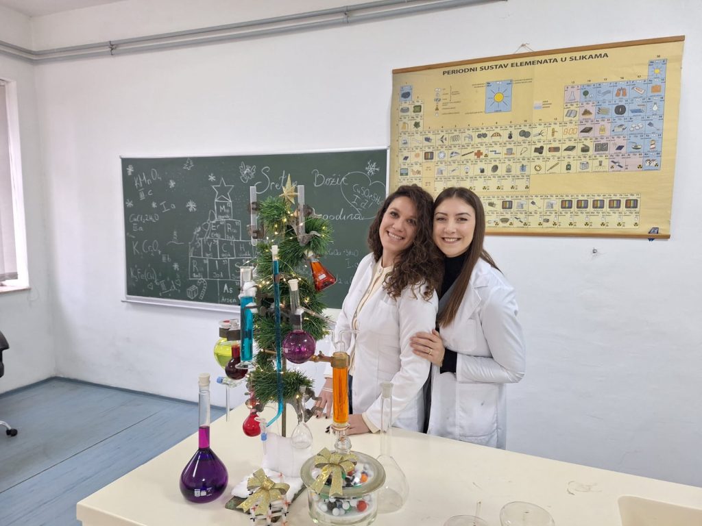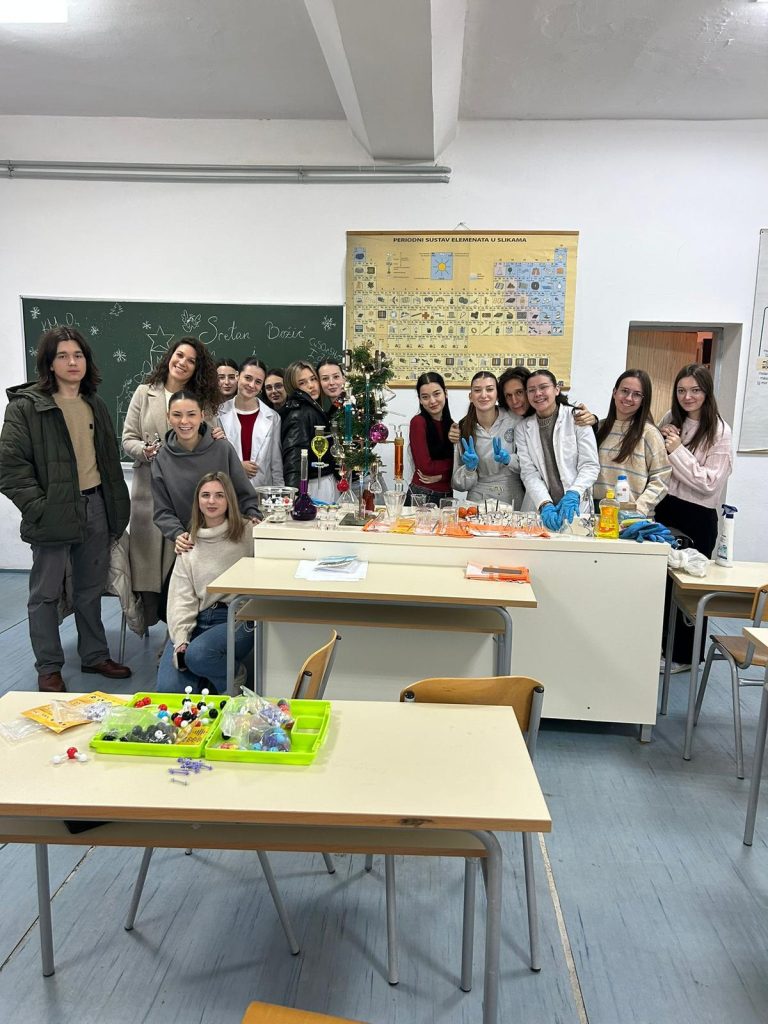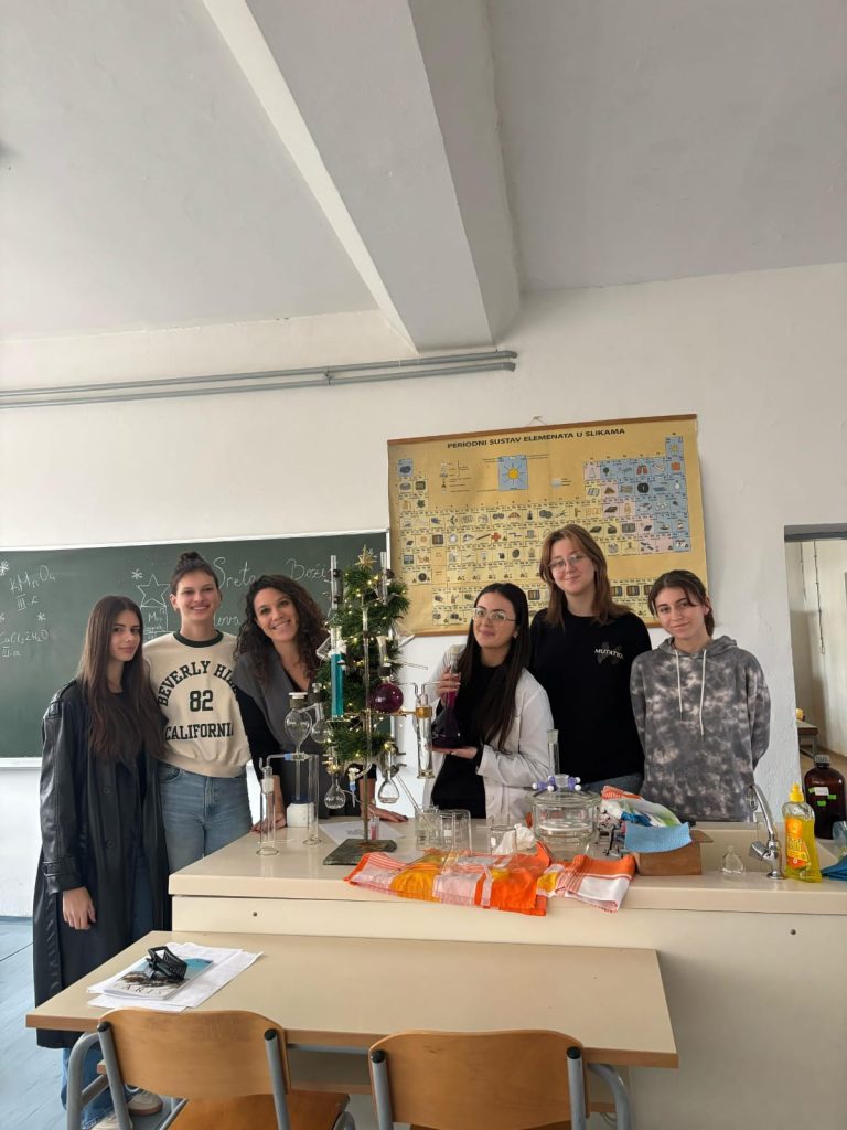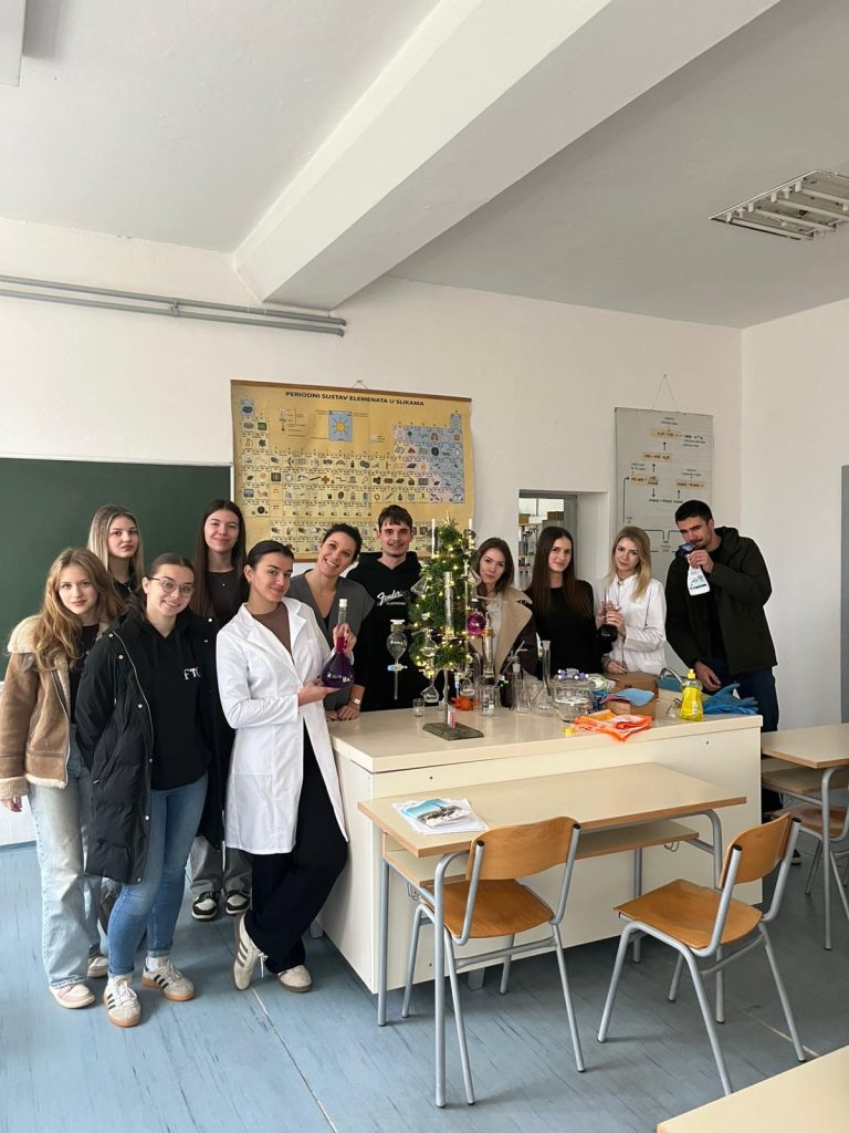 Veselo je ovih dana bilo u kemijskom kabinetu Gimnazije Marka Marulića. Učenici svih razreda imali su zadatak ukrasiti božićnu jelku uz pomoć profesorica Ivone Krišto i Ivane Andrić. No, ukrasi nisu bili uobičajeni. Pripremale su se otopine različitih boja i koncentracija na oduševljenje učenika. Ispod jelke nalazili su se prigodni kemijski pokloni- “slatkiši” napravljeni od modela atoma i molekula.